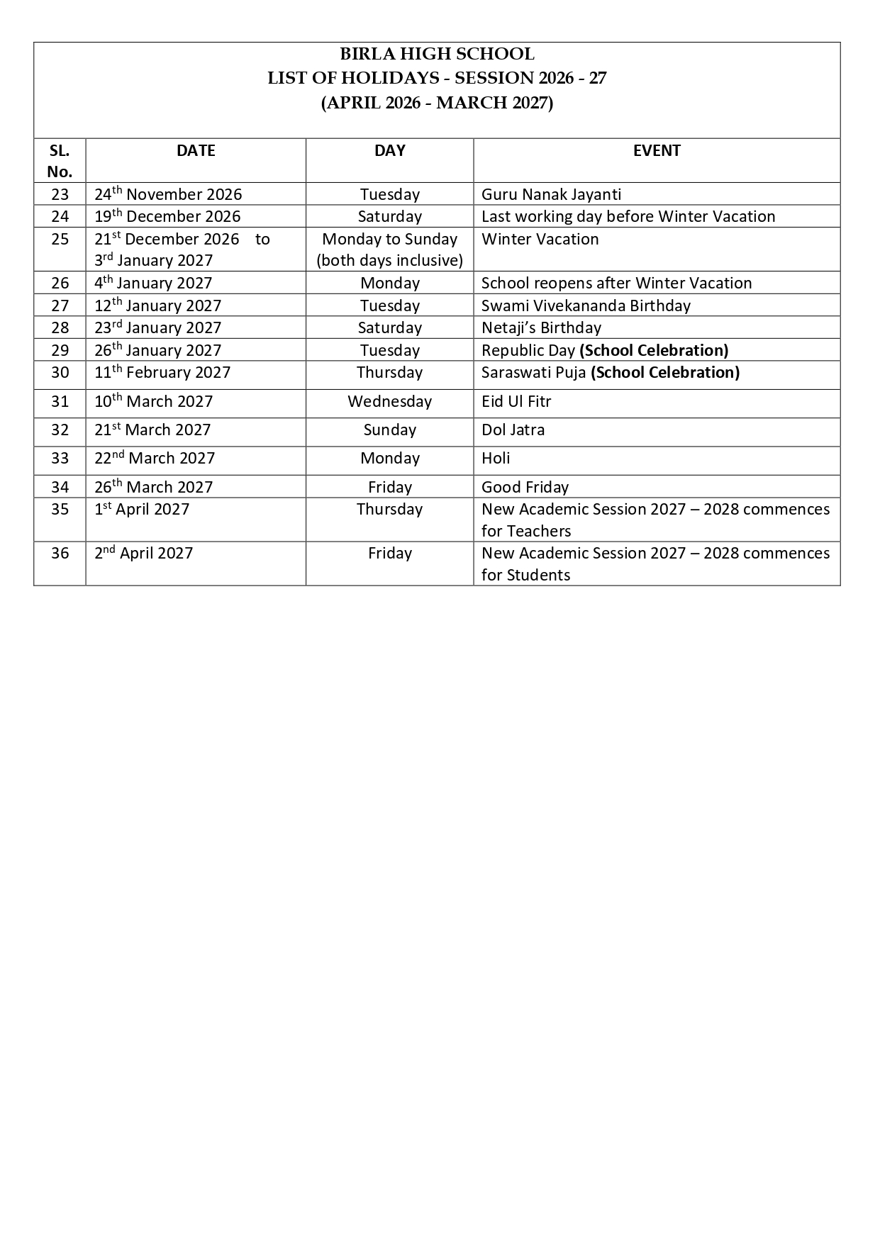 | Netaji’s Birthday Saraswati Puja (School Celebration) | Friday | 23rd January 2026 |